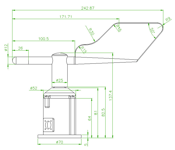 采用法蘭安裝方法,螺紋法蘭連接使風向傳感器下部管件牢牢固定在法蘭盤上,底盤Φ70mm,在Φ61mm的圓周上開四個均Φ5mm的安裝孔,使用螺栓將其緊緊固定在支架上,使整套儀器保持在最佳水平度,確保風向數(shù)據(jù)的準確性,法蘭連接使用方便,能夠承受較大的壓力。