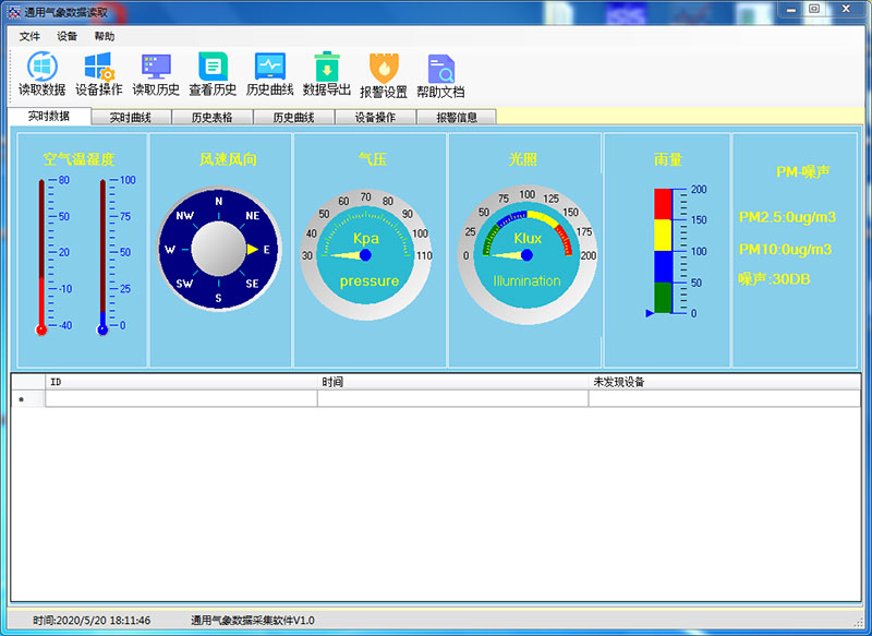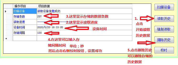 點擊右側(cè)的刷新,在串口號后面選擇剛才查看到的COM口號,點擊查找,此時軟件會識別到設(shè)備信息,并在左側(cè)顯示出來。①讀取數(shù)據(jù),可以觀察到傳感器的實時數(shù)據(jù)。②讀取歷史數(shù)據(jù):點擊讀取歷史可讀取歷史數(shù)據(jù)